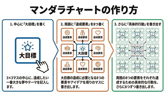 大谷選手が高校時代に作成したチャートでは、中心に「ドラ1 8球団」という大目標を据え、その周囲に「体づくり」「コントロール」「キレ」「メンタル」「スピード160km/h」「人間性」「運」「変化球」の達成要素を配置。さらにそれを実現するための行動として、直接野球に関わることだけでなく、「人間性」を高める行動や、さらに「運」を磨く行動として「ゴミ拾い」、「審判への態度」までが詳しく具体的に記されていたことは、多くの報道でも紹介されています。この手法は、中心の1マスに目標、周囲の8マスに達成要素、その外側に具体的な行動を書き込む計81マスの構造が特徴です。